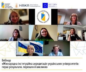 19 лютого працівники Відділу акредитації взяли участь у вебінарі «Міжнародна інституційна акредитація українських університетів: перші результати, переваги й виклики», організований у межах спільного проєкту Національного агентства із забезпечення якості вищої освіти та Естонського агентства якості освіти (HAKA) за підтримки ESTDEV.
